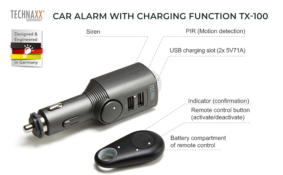 充电功能 – 2 个 USB 充电端口,每个端口输出功率为 5V/1A,允许您使用点烟器插座(如输入 DC 12–24V)同时为 2 台设备充电。此外,它还具有 2.8A 过流保护和短路保护,因此您不必担心自己受伤或损坏智能手机、平板电脑等。充电功能仅适用于点烟器汽车输入,但警报功能无需任何电线或输入即可工作